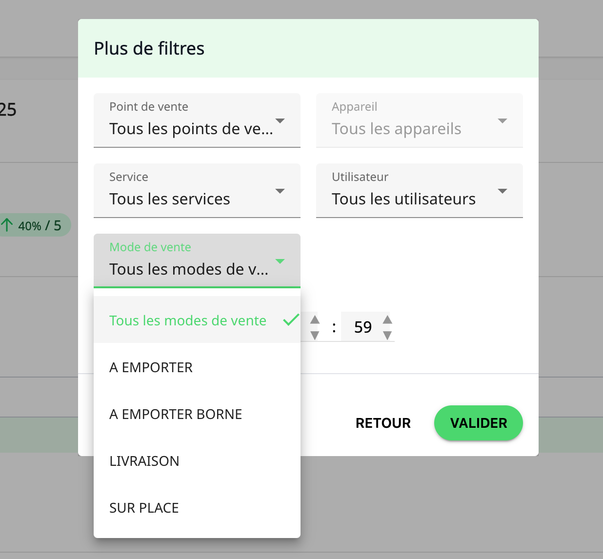 Selon la configuration définie selon vos besoins, les noms des modes de vente peuvent varier, comme : « Commandes bornes », « À emporter borne », etc