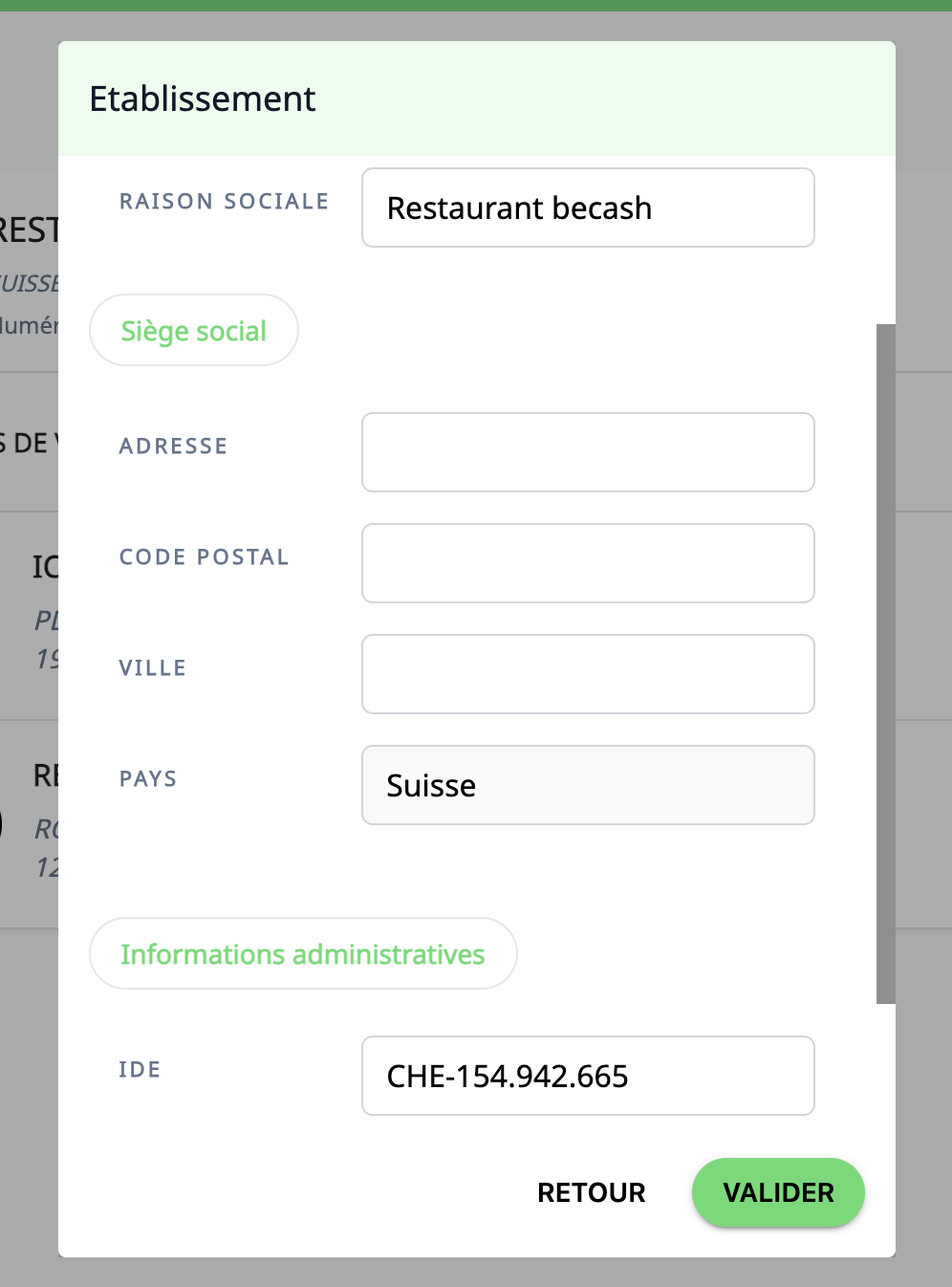 Les informations renseignées dans votre établissement et vos points de vente correspondent aux informations légales de votre société.