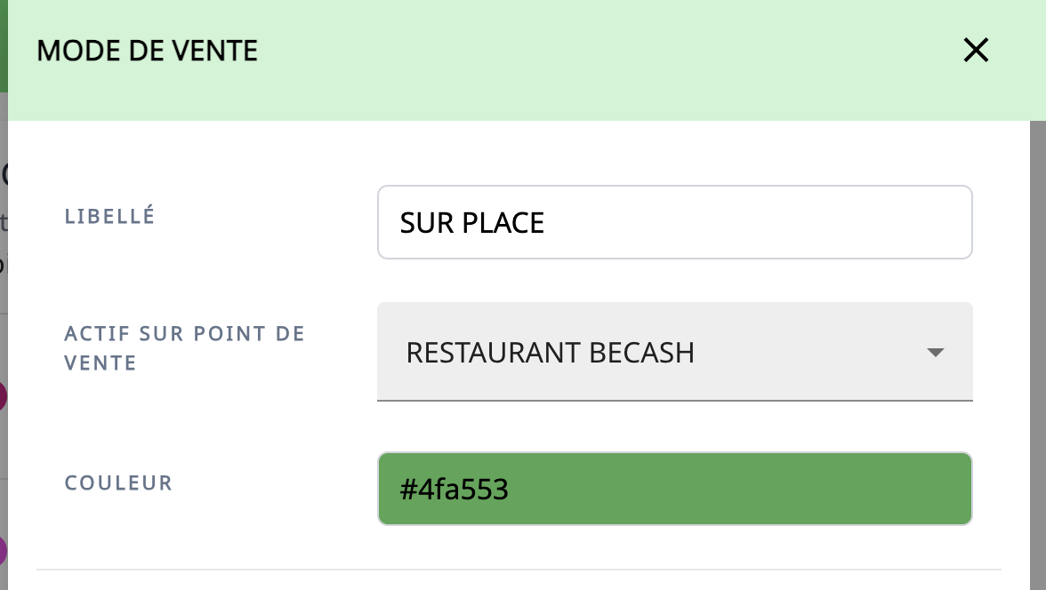 Permet de définir les modes de vente disponibles (ex : sur place, à emporter, livraison).