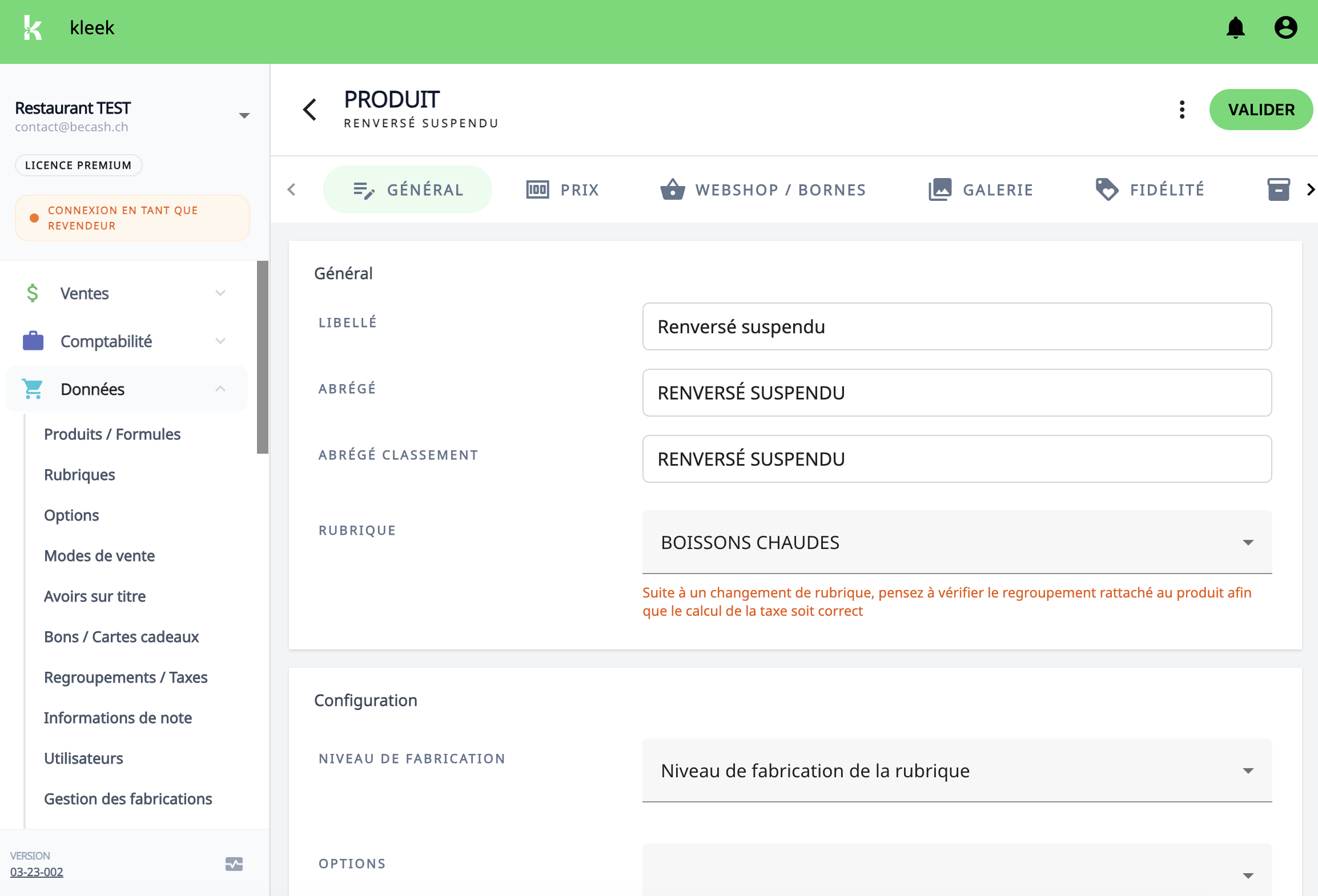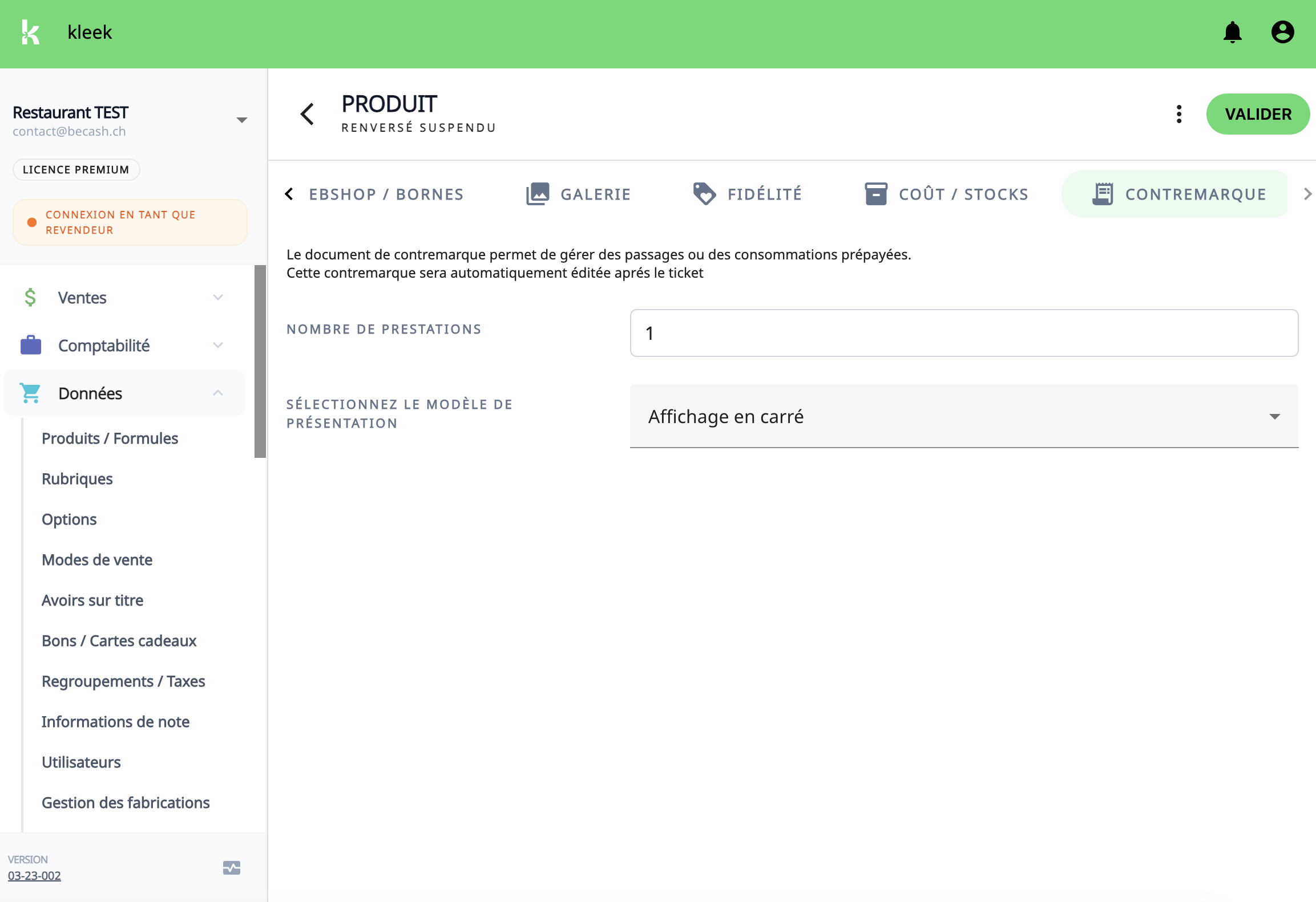 Veuillez-vous connecter sur votre espace de gestion en ligne : https://admin.kleek.ch/ Suivez attentivement les étapes ci-dessous : 1. Accédez aux données et sélectionnez "Produits/Formules". 2. Ajoutez un article en cliquant sur l'icône "+" en haut ...