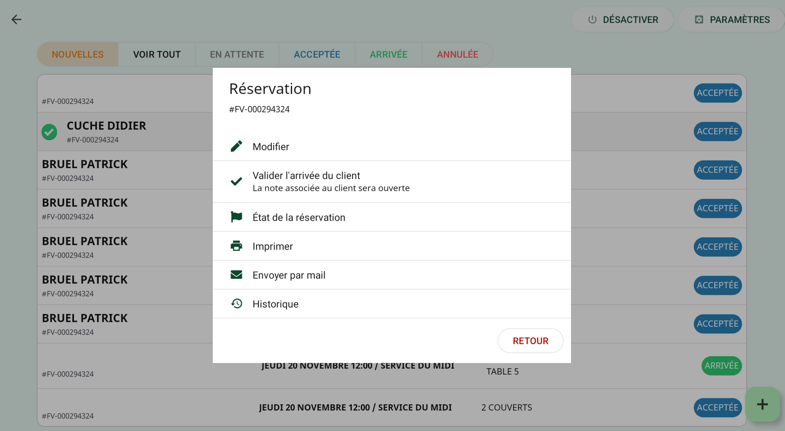 - Historique : consulter toutes les actions réalisées sur la réservation (création, changement d’état, modifications, association à une table, heure d’arrivée, etc.).