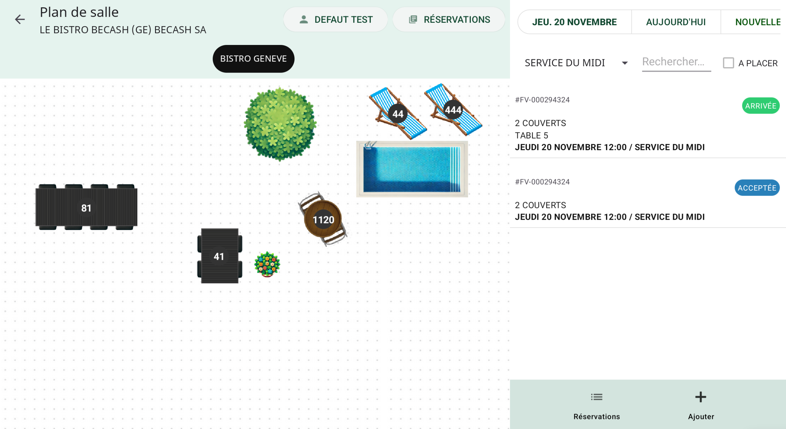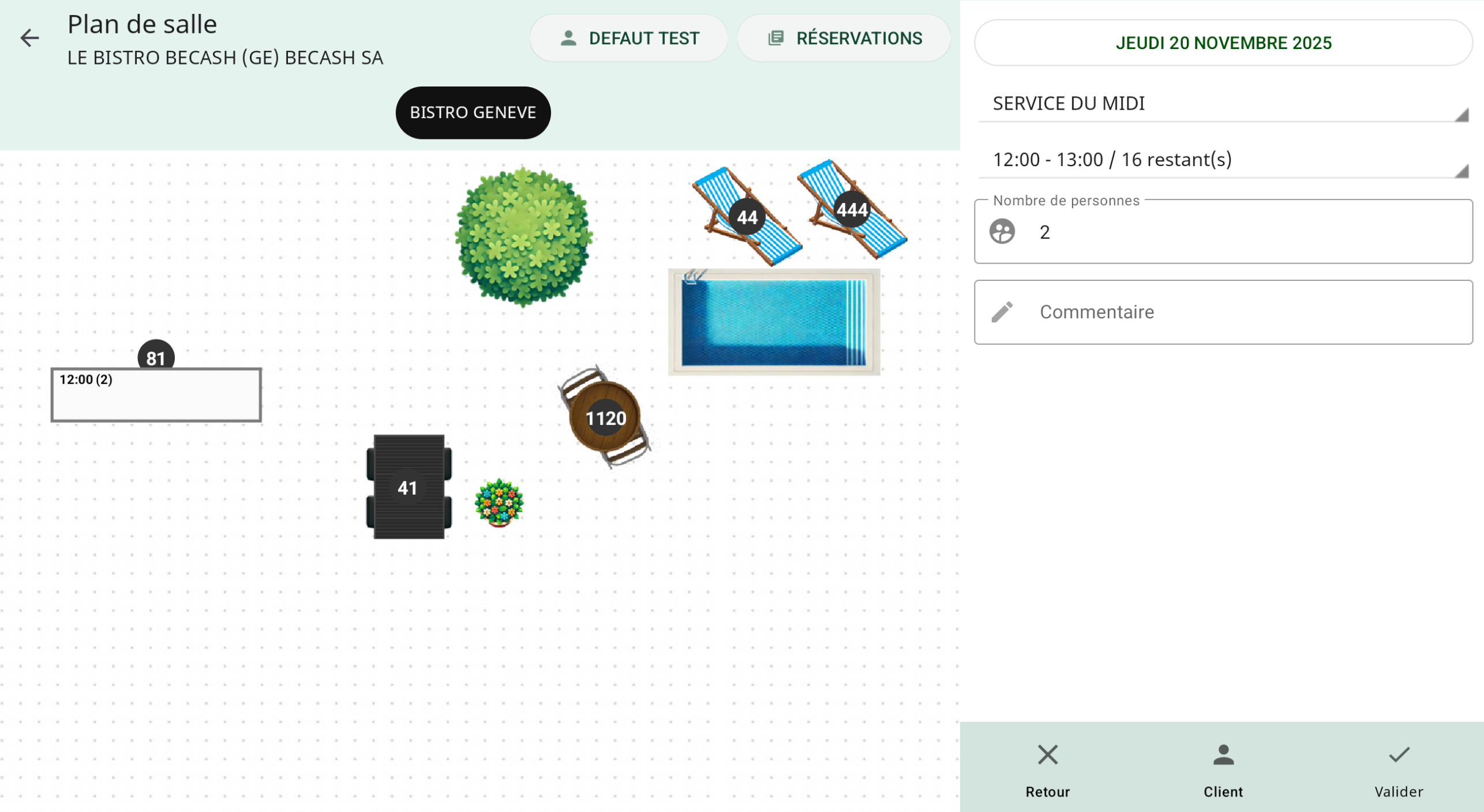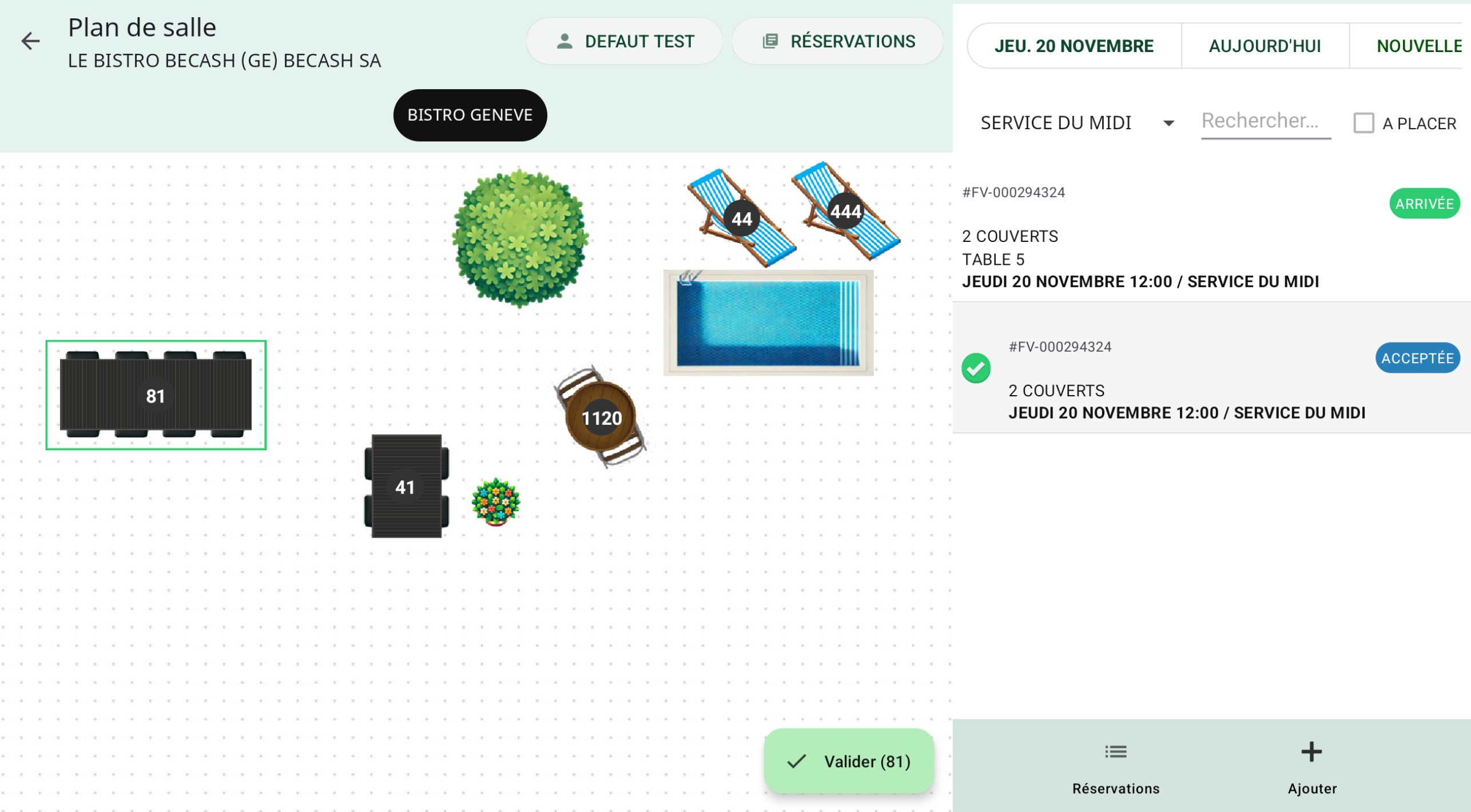 - Choisissez l’emplacement souhaité (ex. Bistro Genève– Table 81).
