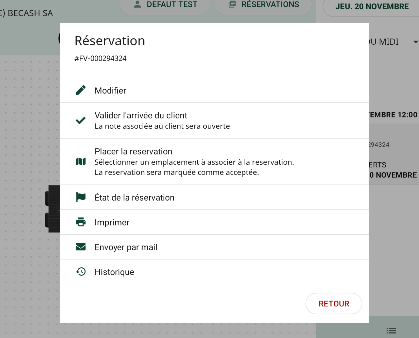En sélectionnant une réservation dans le plan de salle, vous accédez aux mêmes actions que dans le menu réservation :