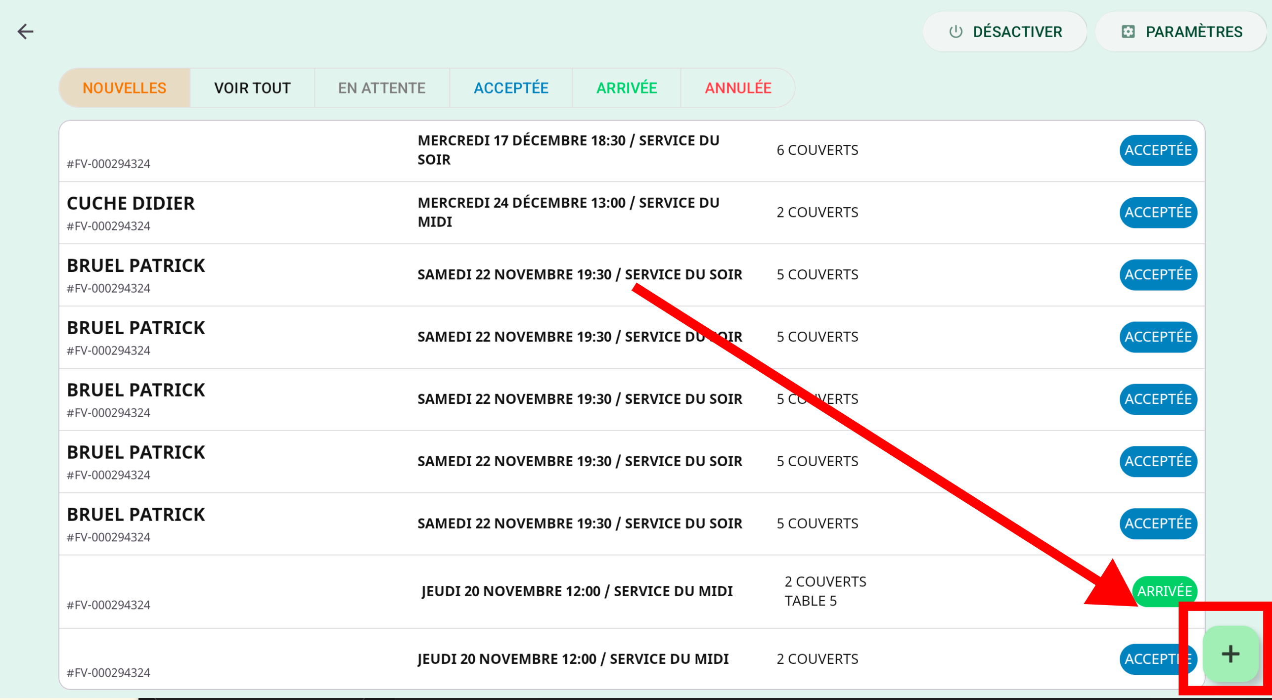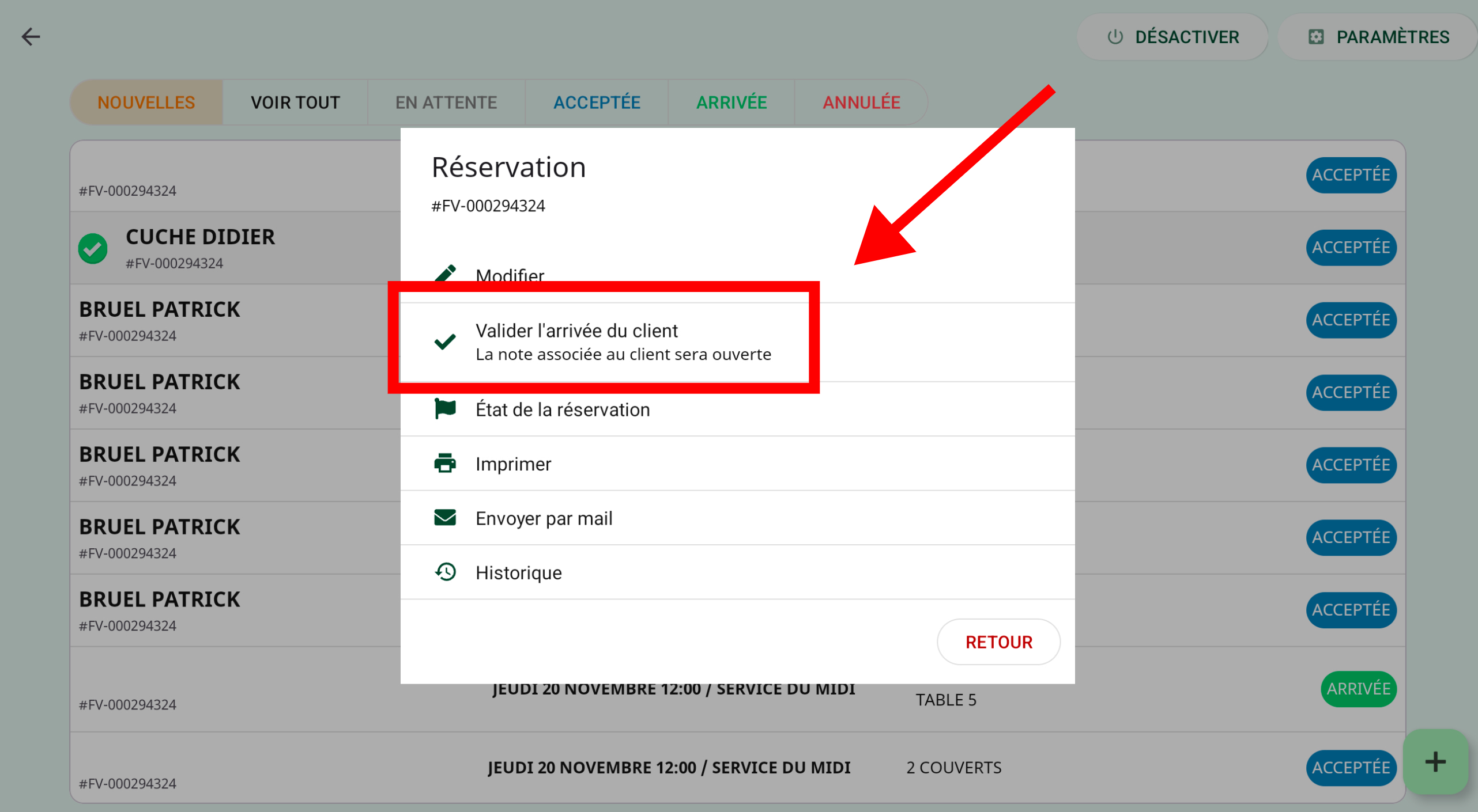 ⚠️ IMPORTANT : Pour que la réservation soit correctement liée au client, vous devez impérativement valider l’arrivée avant d’ouvrir la note.